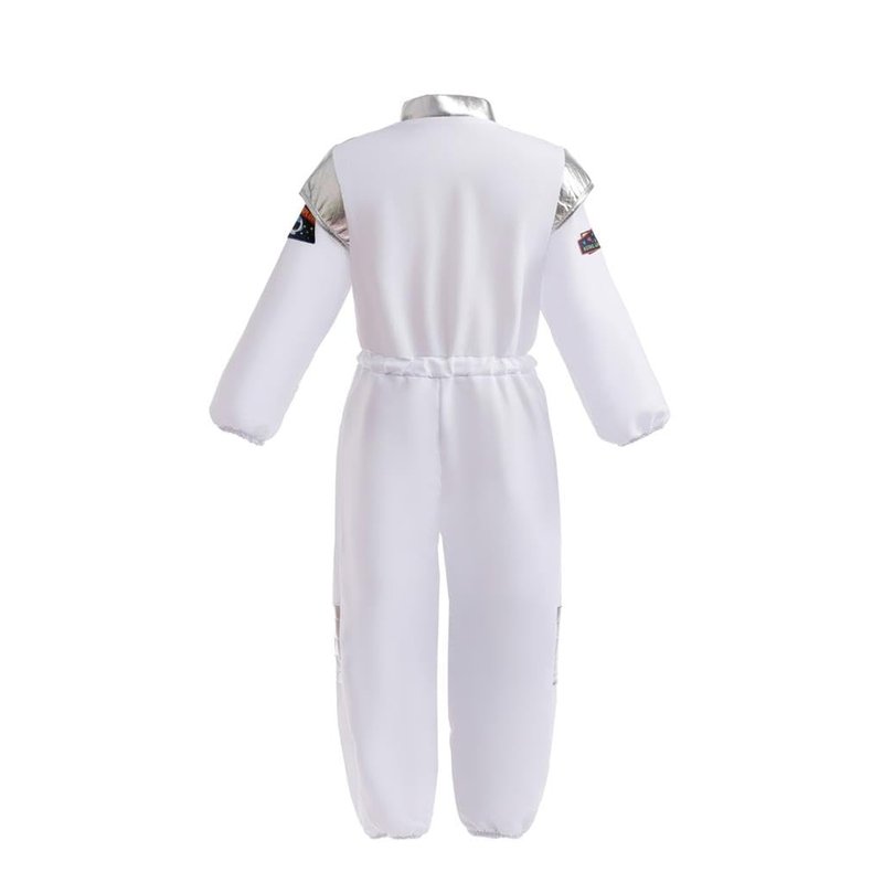 - 🚀Long sleeve white jumpsuit with space, Astro planet and rocket patches on chest and sleeves. Silver fabric details on shoulders and knees making the space suit more realistic! Elastic sleeve and trousers cuffs.
