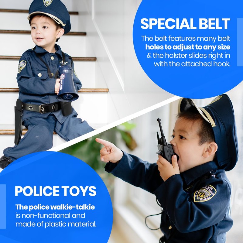 - Kids Police Costume - The cop uniform costume set includes a shirt, pants, hat, belt, whistle, gun holster, and walkie-talkie. Realistic accessories for the aspiring police officer.