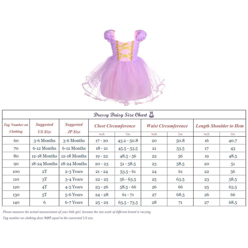 - Size for baby, toddler and little girls: 6-12 months, 12-18 months, 18-24 months, 2T, 3T, 4T, 5T, and 6. Age is only an approximation of size. Please measure the actual body size and refer to the size chart to choose a proper size for best fit. There may be minor size difference depending on size measuring method.