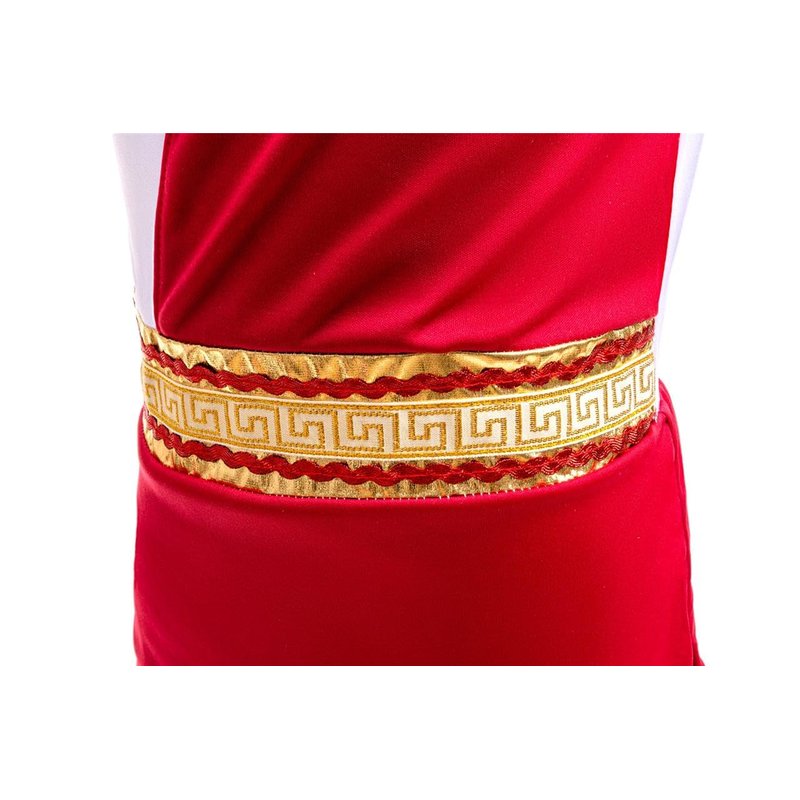 - One piece white and red surplice dress. Sleeveless and V neck. 2 layer of skirts, patterned gold trims at hemline and waistband. Featuring a shiny red sheer tulle draped between the sequin wristband and armband.