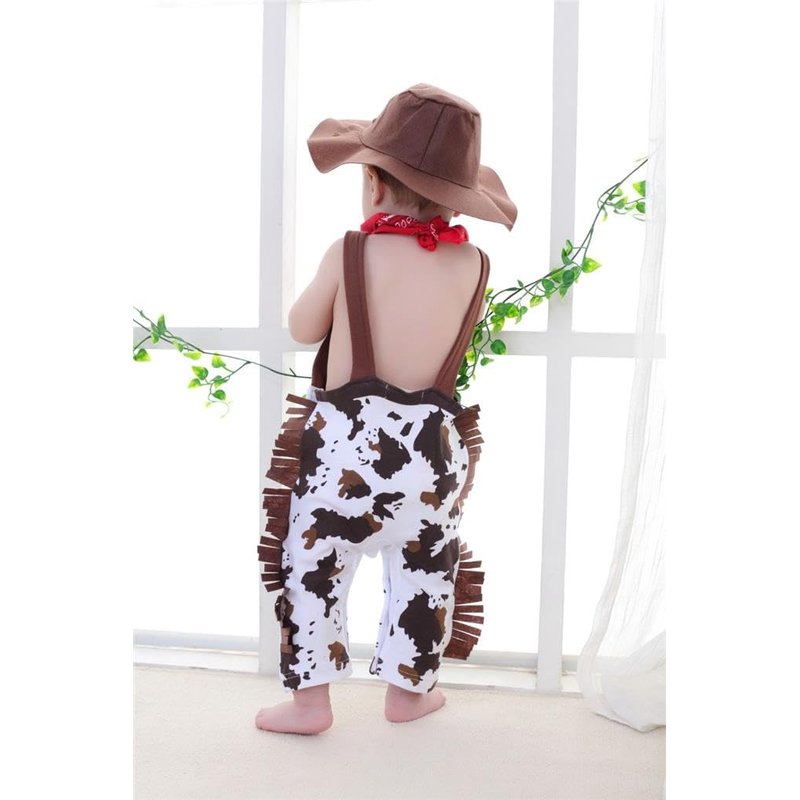 - Cute cowboy overalls costume outfit set for baby and toddler boys! 3 pieces dress up set: Sheriff Hat, Red Bandana Neck Scarf and Cowboy Chaps Overalls Pants.