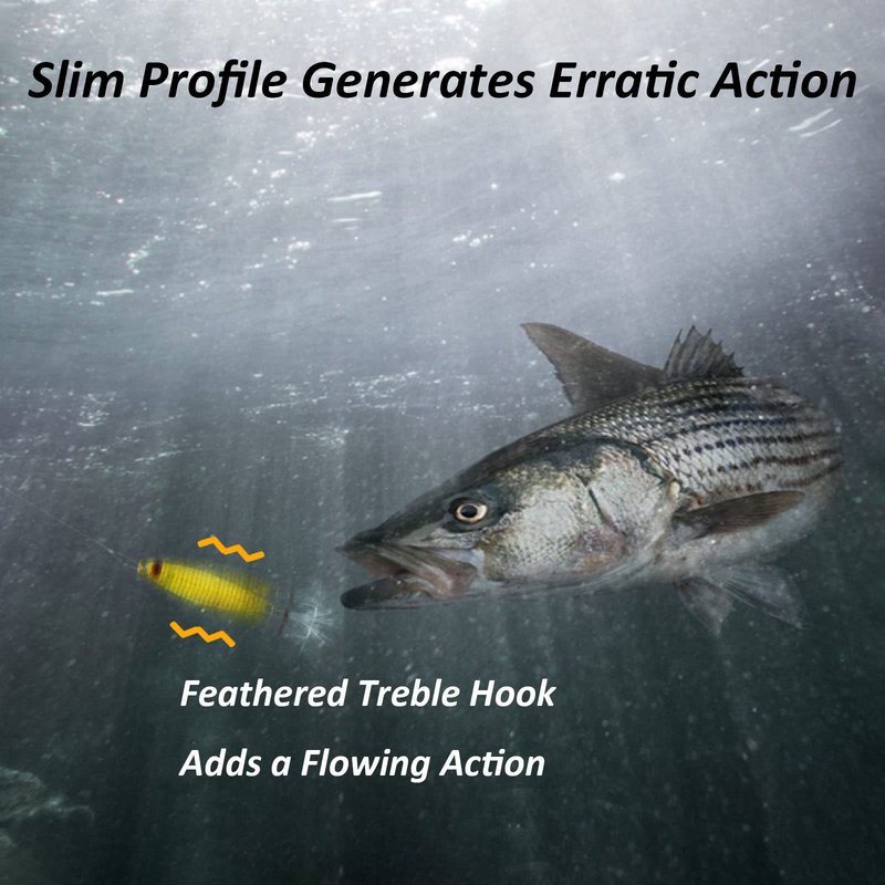 - Slim profile generates erratic action when jigged and ripped through the water, entice fish to strike and the feather treble seal the deal.