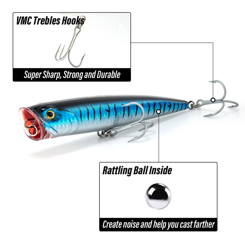Dr.Fish Topwater Popper Saltwater Fishing Lures, 5-1/2 Inches GT Popper VMC Treble Hooks Surf Fishing Lures for Stripr Pike Salmon Lures Bass Popper Fishing Plugs Offshore Blue Stripes