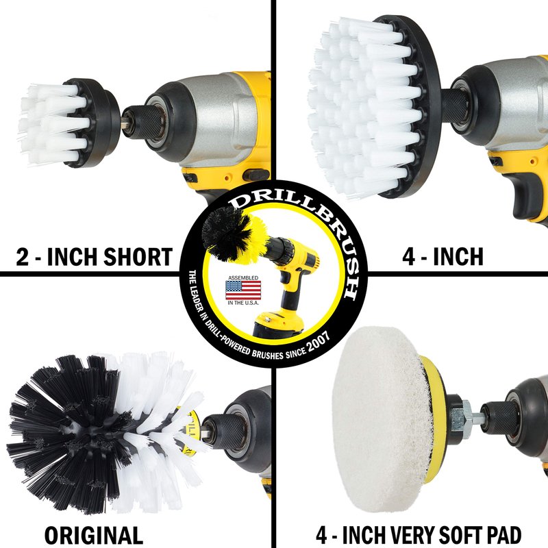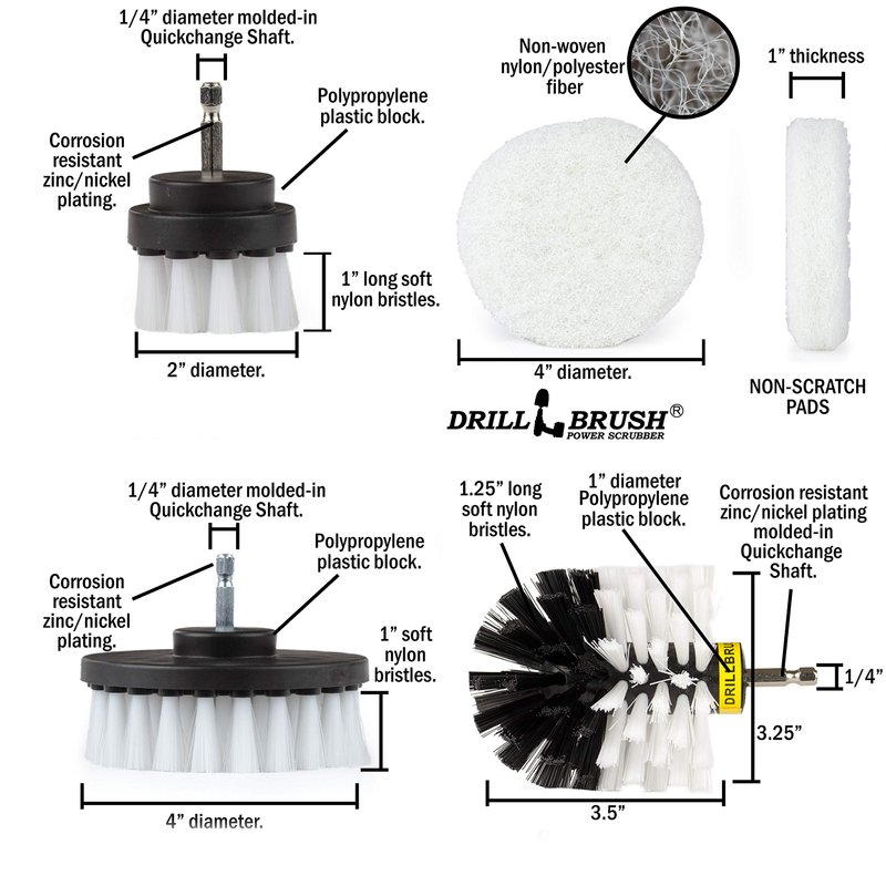 DRILL BRUSH SCRUBBING Combination drill powered brush and pad kit. The brushes are medium blue and are great for outdoor pool/spa or indoor kitchen cleaning tasks. Use the scrub pads to work with the brushes, or by themselves to clean around your hot tub area or indoor (bathroom and/or kitchen surfaces). Clean faster and better than ever before with Drillbrush products. Drillbrush was established in 2007, we have been designing and innovating brushes based on feedback and demand from our valued customers. Our brushes are professional quality and have been tested and approved by commercial cleaners, marinas, detail shops, and others industry “hands on, daily user” reviewers to be the absolute best solution for a wide variety of cleaning and scrubbing tasks. Always look for the “Drillbrush Power Scrubber” logo to insure you are buying an authentic Drillbrush from the leader in drill powered cleaning brushes. Drill NOT included.
