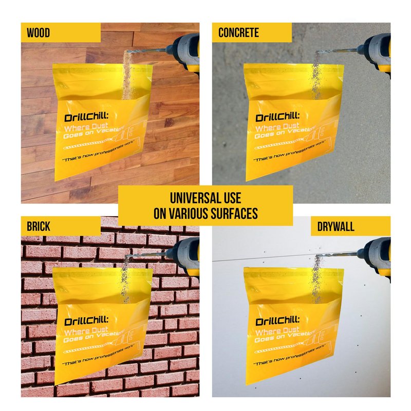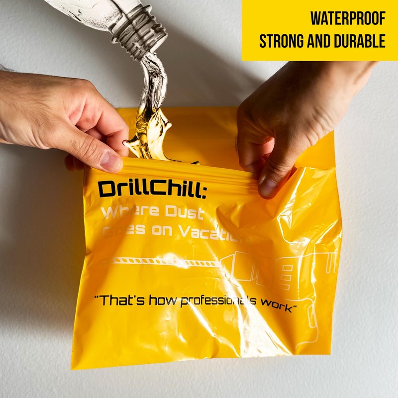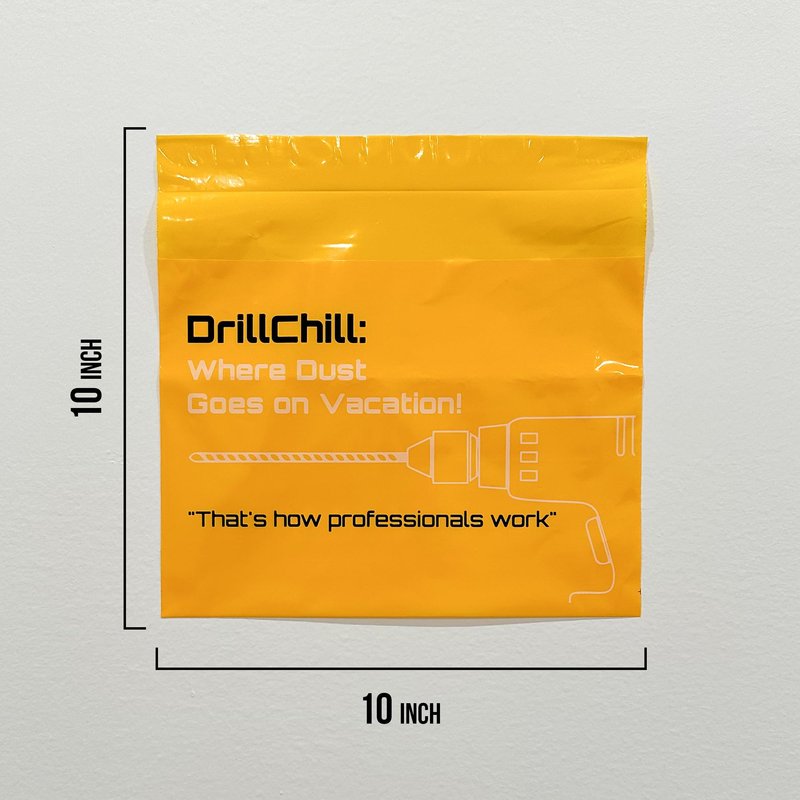 Introducing DrillChill Dust Catcher Bags, the ultimate solution for a clean and tidy workspace while drilling. Designed for professionals and DIY enthusiasts alike, these easy stick-on, disposable dust collector bags effectively capture fine dust particles generated during drilling. Whether you're working on drywall, brick, or concrete, DrillChill ensures your floors stay spotless. Unique Features Self-Adhesive Convenience: Each bag comes with a strong adhesive strip that easily attaches to the wall, making setup quick and hassle-free. Leakproof Design: Engineered to prevent any dust from escaping, our leakproof bags guarantee a clean environment every time. Disposable and Hygienic: Once full, simply remove and dispose of the bag. Each pack includes 30 disposable bags, ensuring you always have a fresh one ready. Product Line Details DrillChill products are designed with the needs of both professionals and home users in mind. Our dust collector bags are part of a comprehensive line of innovative solutions that make drilling projects cleaner, easier, and more efficient. Product Specifications Quantity: 30 bags per pack Material: Durable, high-quality plastic Adhesive Strip: Strong, reliable adhesive for secure attachment Compatibility: Suitable for use on drywall, brick, concrete, wood, and other surfaces Dimensions: Each bag measures 10 inches by 10 inches. Weight Capacity: Designed to hold a significant amount of dust without tearing or leaking Professional Advantage Using DrillChill Dust Catcher Bags on various projects not only ensures a clean and professional workspace but also enhances your professional image in front of clients. By maintaining a tidy job site, you demonstrate attention to detail and professionalism, making you more competitive in the marketplace. Clients will appreciate the clean environment and are more likely to recommend your services. Additionally, the clean, dust-free workspace can justify higher service charges, increasing your overall earnings. DrillChill Dust Catcher Bags are your go-to solution for maintaining a dust-free workspace while drilling. Enjoy the convenience, efficiency, and cleanliness that only DrillChill can provide. Make your next project a breeze with our professional-grade dust catcher bags.