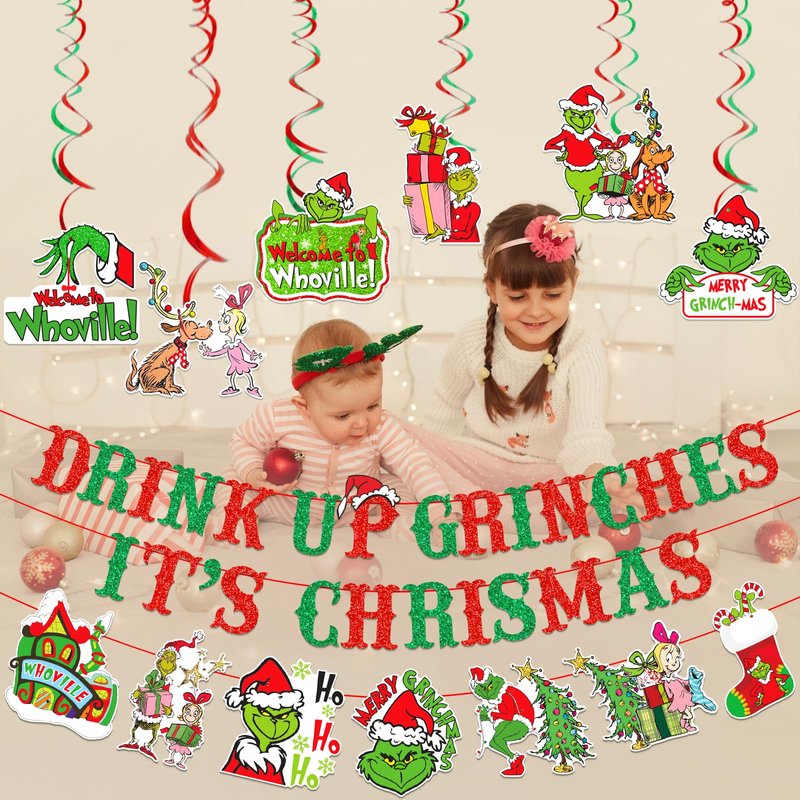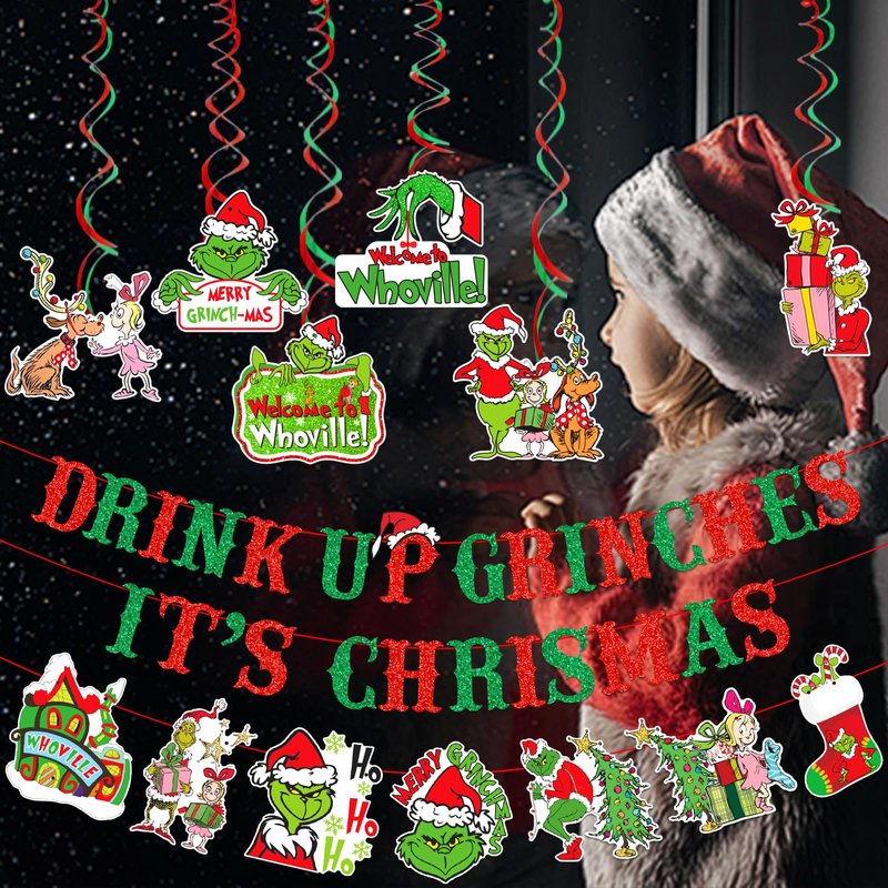 - Package include: Our green monster christmas decorations banner package contains 1 pcs Drink Up Christmas banner. 6pcs green monster party cutouts with hanging swirls.