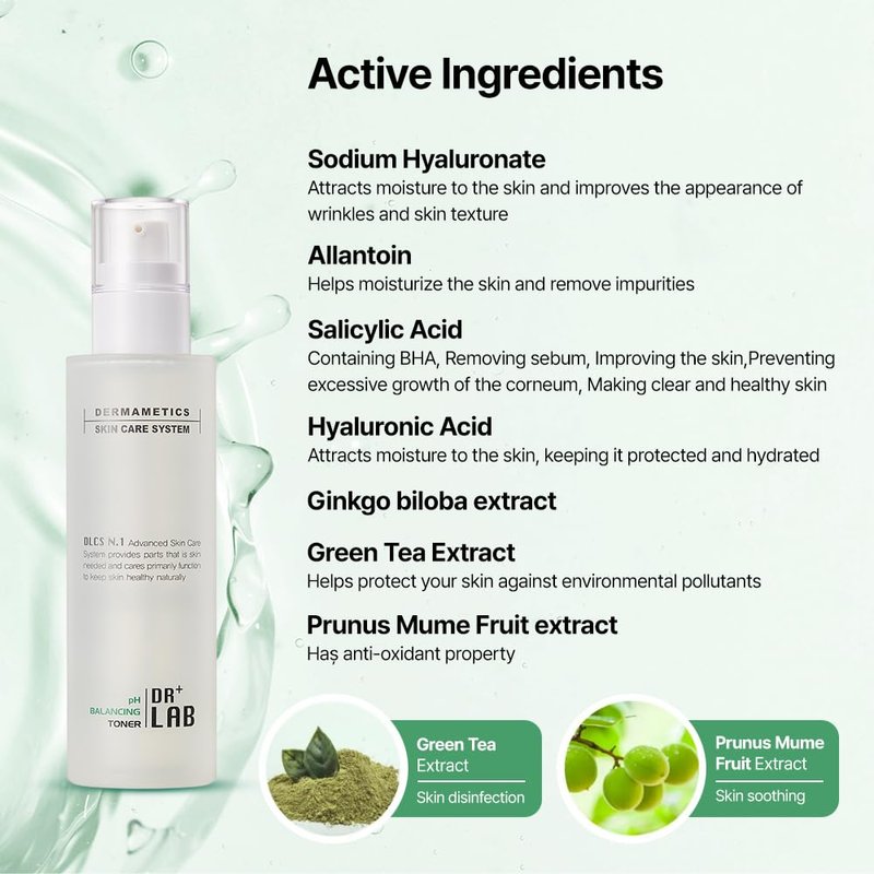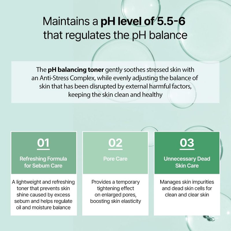 pH Balancing Toner keeps skin clean and healthy with Anti-Stress Complex softly soothing stimulated skin from stress and evenly adjusting the balance of the skin being ill-balanced from external harmful factors. A pore-refining toner with salicylic, lactic acids, Prunus mume fruit extract, hyaluronic acid, and ginkgo Biloba extract removes excess oil, clarify and helps unclog and minimize the appearance of pores.