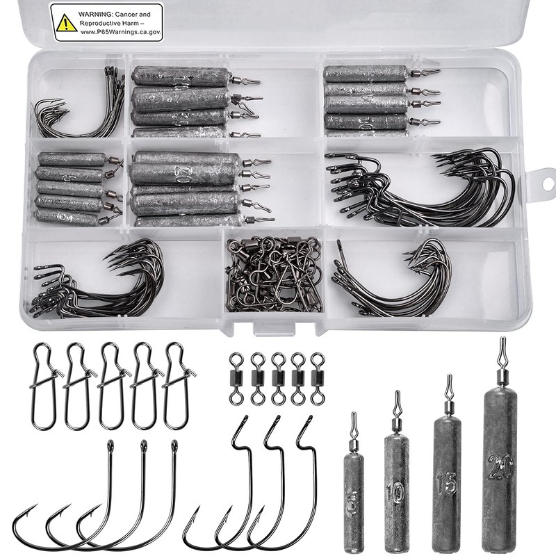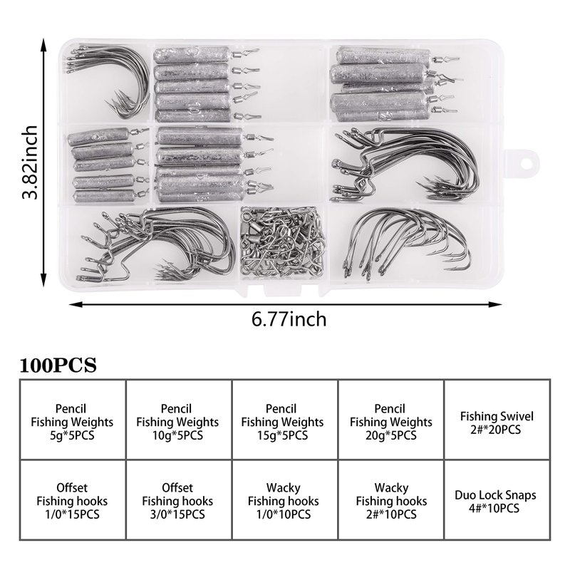 - Kit Includes: drop weight 1/5oz 5pcs, 3/8oz 5pcs, 1/2oz 5pcs, 3/4oz 5pcs. fishing swivels 20pcs, duo-lock snaps 10pcs, offset hooks 30pcs, wacky hooks 20pcs.