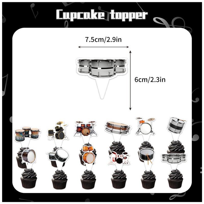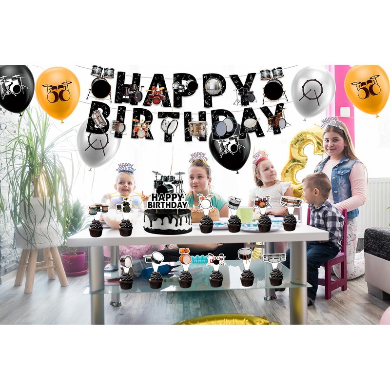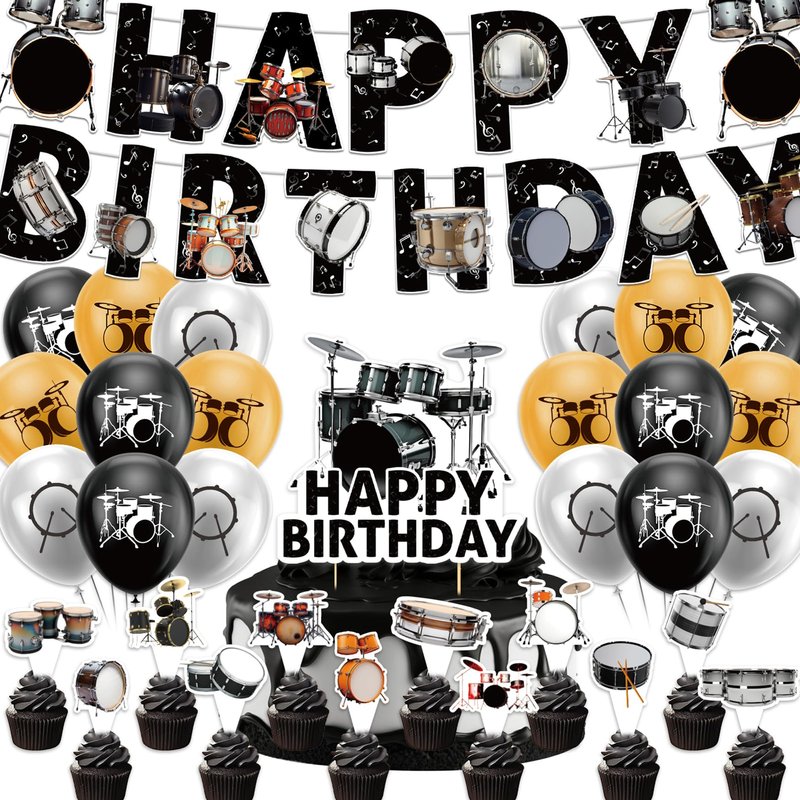 - Drums Party Supplies: You will get 1 HAPPY BIRTHDAY banner, 1 HAPPY BIRTHDAY cake topper, 12 cupcake toppers, 18 balloons (6 black, 6 yellow, 6 gray), 1 ribbon.