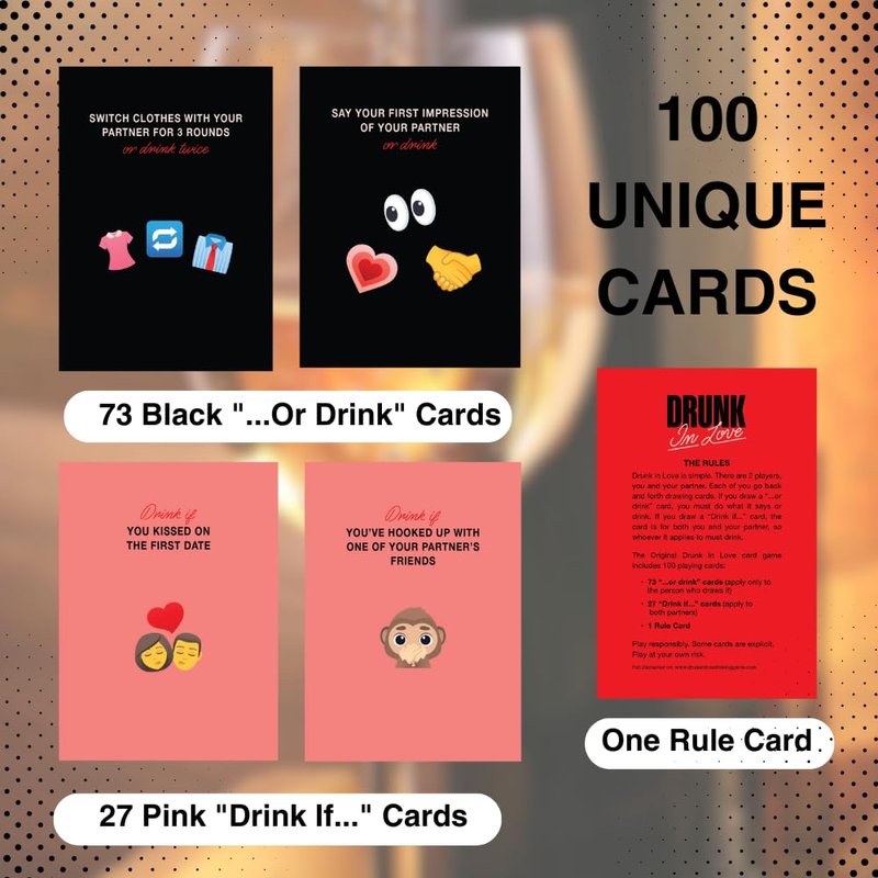 - Ultimate Couples Drinking Games: Ignite the spark in your relationship with "Drunk in Love," the original drinking card games for couples. Featuring 99 unique dare cards with 1 rule card designed to test your bond, these adult games ensure endless laughter and unforgettable moments.