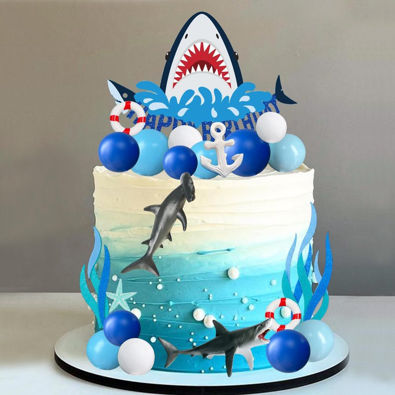 • 【Package Contents】1 happy birthday cake topper, 1 hammerhead shark figurine, 1 megalodon figurine, 2 seaweeds, 1 blue starfish, 2 swim rings, 1 anchor, 5 royal blue balls, 3 dark blue balls, 2 light blue balls, 3 white balls.