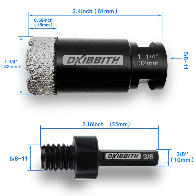 • Specifications- Hole Saw Diameter 1-1/4 inch(32mm); Connection 5/8 -11 arbor; Diamond height 5/8inch (15mm), Total length 2/4inch (61mm). Max Cutting depth1-5/8inch (40mm)