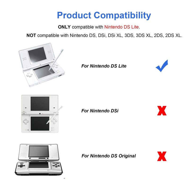 - 🎮【Product Compatibility】: ONLY compatible with Nintendo DS Lite. NOT compatible with Nintendo DS, DSi, DSi XL, 3DS, 3DS XL, 2DS, 2DS XL.