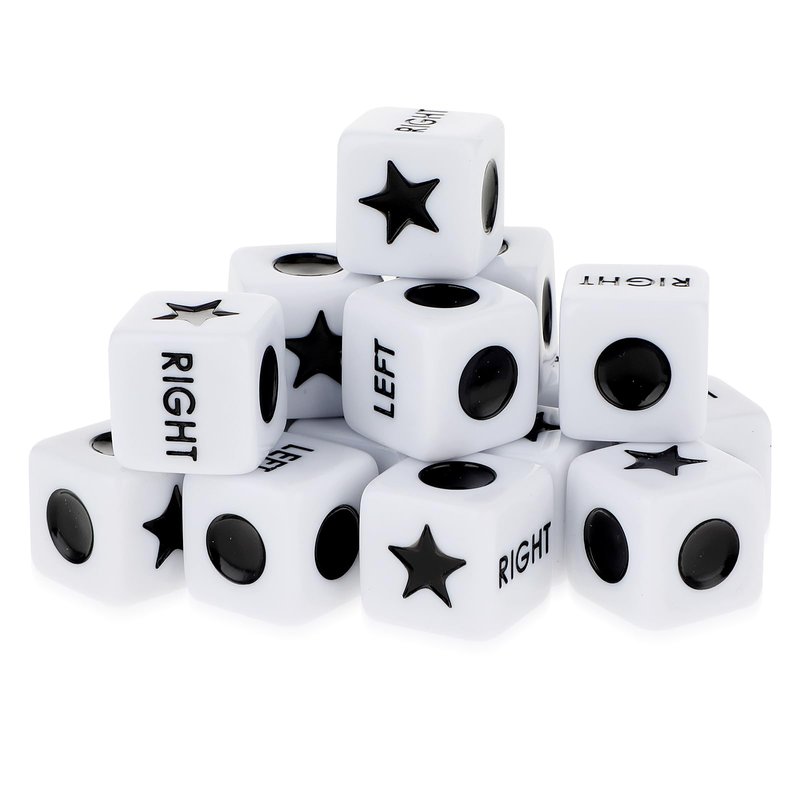 - Dice Design: These cube dices are marked with 4 signs, "Left", "Right", "Star" symbol and "Dot" symbol. fast-paced fun game, have a great time with your friends or family. Recommended age: 13 years old or above.