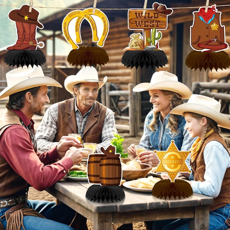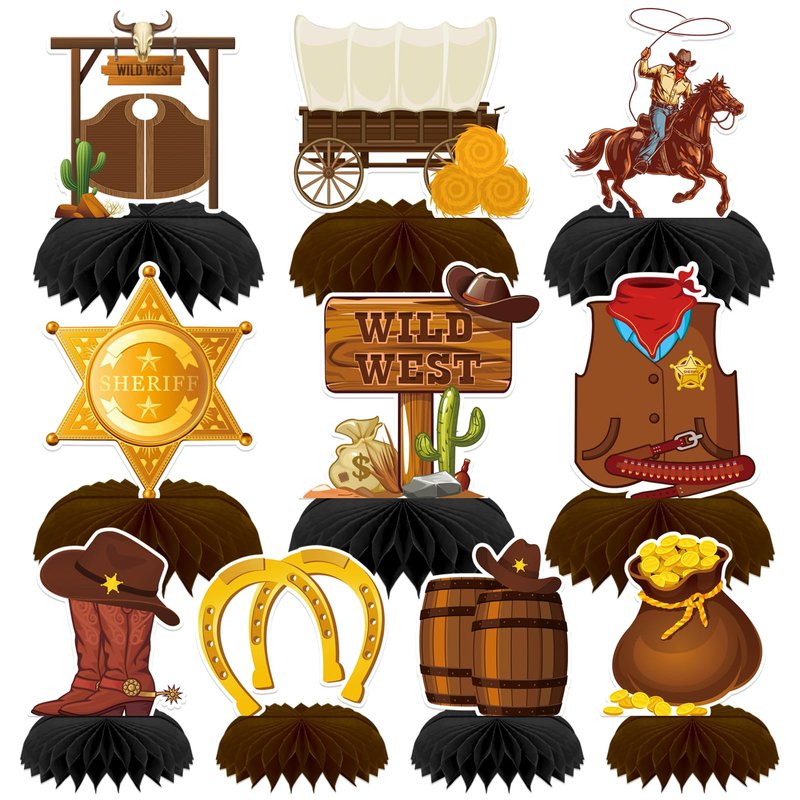 - Cowboy Party Decorations: 10 cowboy party decorations, inspired by cowboys, designed with horses, boots, barrels and other shapes, full of western customs. Put western party decorations in the living room, dining room, office and other places, instantly add unique charm to these spaces, and make you feel like you are in the world of cowboys and become the focus of attention
