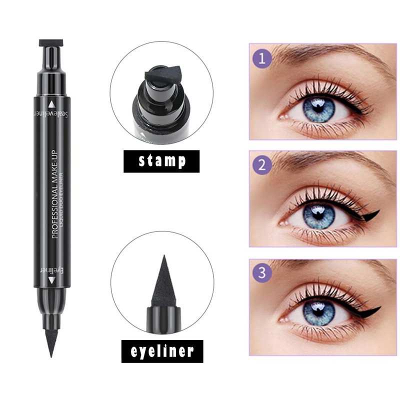 Dual Ended Black Liquid Eyeliner - 2 in 1 Winged Cat Eye Stamp & Felt-tip Eyeliner Pen, Waterproof, Long Lasting and Smudge Proof Eye Makeup Tool for Women