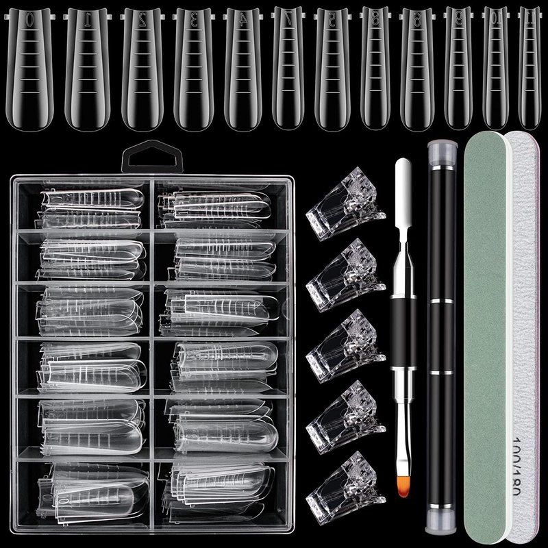 Dual Nail Form Set Clear Gel Nail Extension Mold 12 Sizes with Scale Full Cover Gel Coffin Nails Dual-ended Gel Brush and Nail File Nail Tips Clip Buffer Polisher