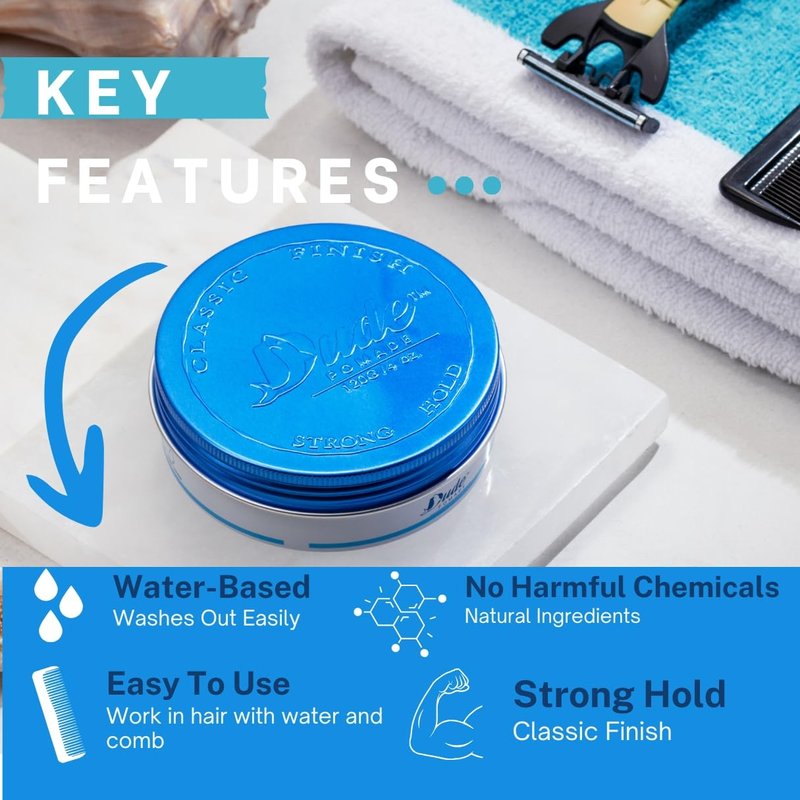 Dude Pomade is crafted for men who value style and control in their hair care routine. This pomade for men delivers a strong hold with a matte finish, ideal for achieving a range of styles, from classic slicked-back to modern textured looks. Designed to provide a natural, non-greasy feel, our mens pomade gives you the confidence of all-day style without the hassle of frequent touch-ups. Our hair pomade for men is made with a pomade matte formula, allowing you to define, sculpt, and shape your hair while maintaining a lightweight texture. Whether you’re looking for a subtle hold or something more defined, Dude Pomade adapts to suit your style needs. This is the go-to palmade for adding volume, enhancing texture, and achieving a look that lasts, even through the busiest days. Perfect for men’s grooming, this versatile pomade is a staple among hair products for men who seek a polished yet effortless appearance. Say goodbye to oily, heavy styling products and hello to a pomade that offers the hold and flexibility you need. Use it daily to keep hair in place, add volume, and create a matte finish that looks effortlessly sharp. Our pomade for men not only enhances your hair’s natural texture but also washes out easily, leaving no residue behind. It’s the ultimate choice for men who prioritize quality, performance, and style in their grooming products. Whether you're heading to the office or a night out, Dude Pomade has you covered with a natural, lasting hold that’s built for every occasion.