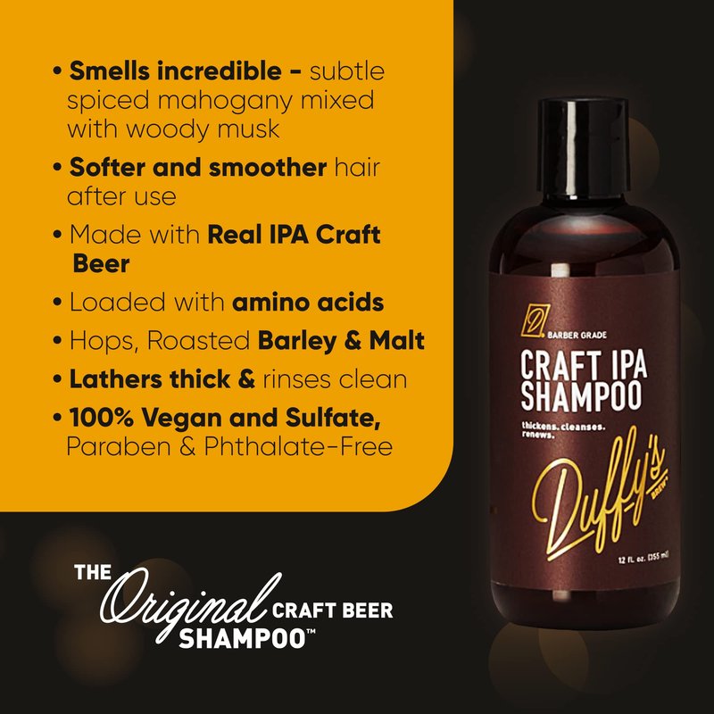 - Men's Hair Products Make Great Gifts: If you are looking for a men's grooming kit why not add this unique craft ipa beer shampoo bottle. Duffy's works with all hair types such as thick, fine, straight, wavy, or curly. Also can be used shampoo for women