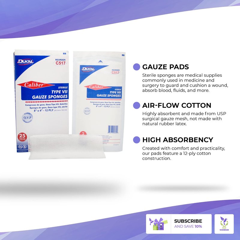 Enhance wound care with Dukal Type VII Gauze Sponges. This pack of 50 sterile wound pads, each measuring 8" x 4", provides optimal wound care with its 12-ply construction. Crafted from sterile 100% cotton, these gauze sponges are ideal for cleaning and prepping wounds. They serve as effective wound care dressing pads, promoting healing and preventing complications. Trust Dukal for high-quality wound care solutions.