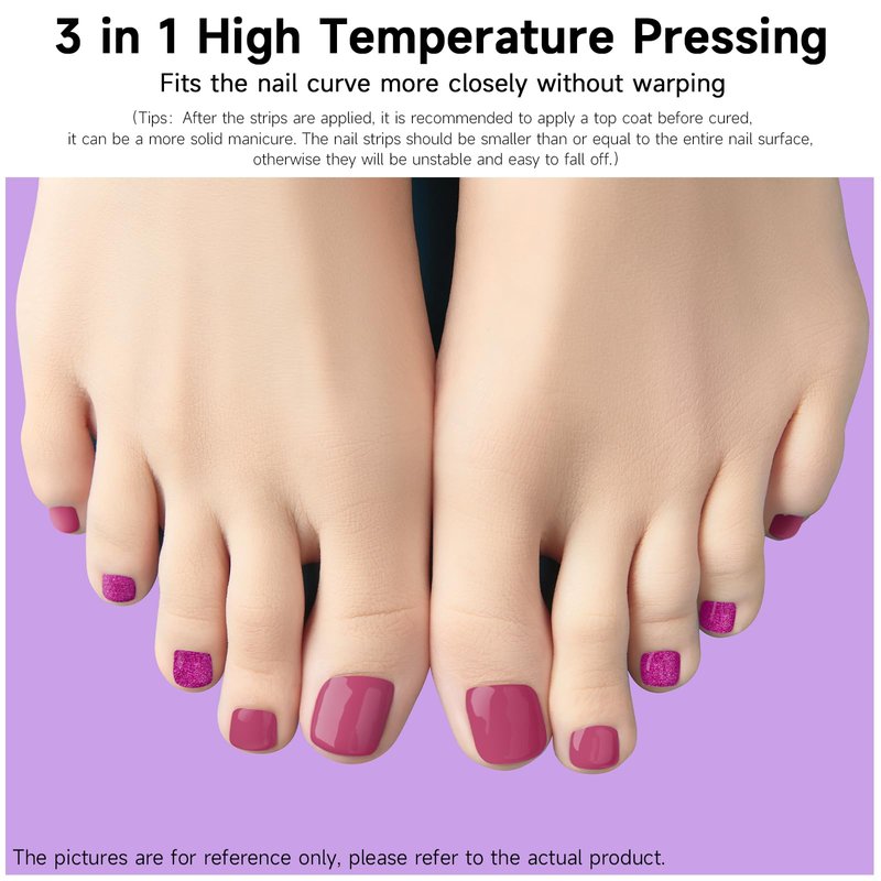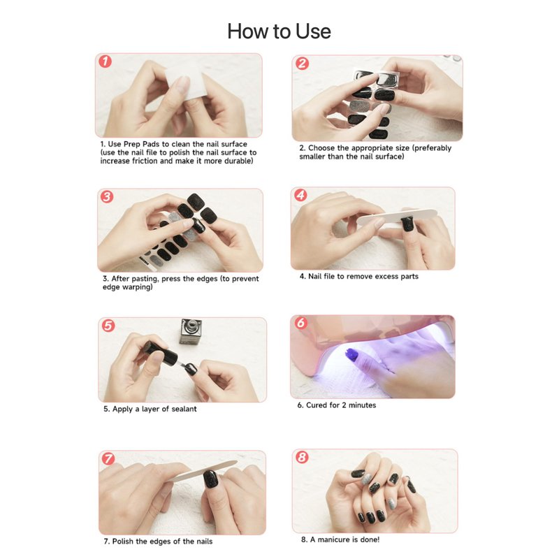 - Make a pair of hands in one minute-DIY nail strips making operation is simple, you only need to spend one minute to stick the gel nail sticker on the nail, (Tips:After the gel manicure stickers are applied to the nails, it is recommended to apply a layer of reinforcing sealer in the baking lamp, so that it can be a more solid manicure.) The nail polish stickers cover is also easy to peel off, just lift the gel nail sticker with the tip of the wooden stick included in the package.