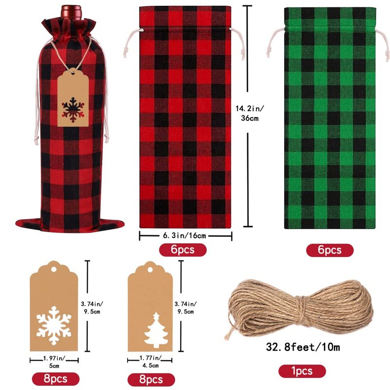 - 【Wide Applications】Christmas wine bottle covers are perfect for decorating wine bottles, classic Buffalo plaid design that never goes out of style, you can use them on important days like Christmas, New Years, birthdays, anniversaries, housewarmings, etc. They can make the festive atmosphere stronger and more festive! You can also use them as gift bags, fill them with candy or other gifts, and write down wishes on gift tags, your families and friends will love the gift like this.