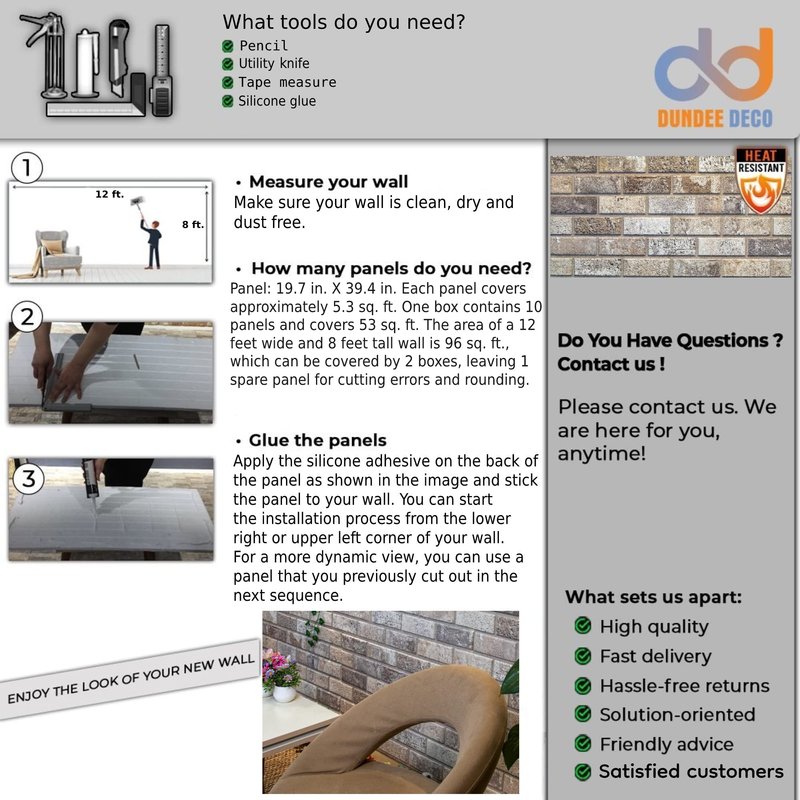 - REAL 3D Brick Stone Look - Made of high-quality EPS material, this wall panel provides a REALISTIC FEEL at a fraction of the cost. Thanks to it's surface structure, you do not feel the artificial effect of applying Dundee Deco wall tiles. Whether brick, rock, or stone look, the cladding of the wall panels is always elegant and durable.