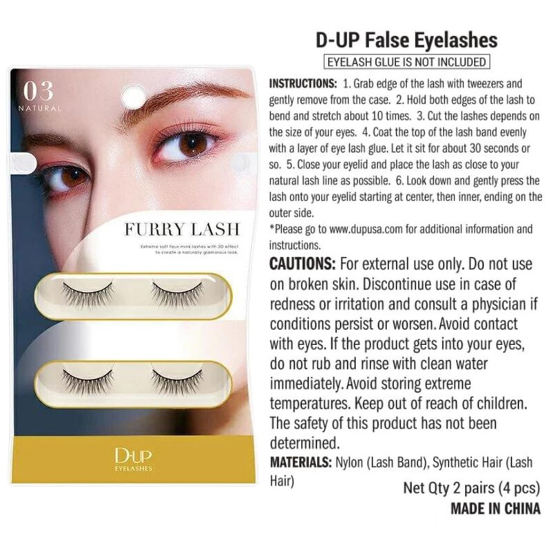 Our Furry Lash collection blends seamlessly with your natural lashes, giving you a beautiful and discreet look perfect for daily wear or special occasions.DUP False Eyelashes offer the ultimate in comfort and longevity. Lightweight and easy to apply, these lashes stay in place all day, ensuring you look your best from morning to night without the need for touch-ups. Whether you're getting ready for a casual day out or preparing for a glamorous event, DUP Furry Lash is versatile enough to suit any occasion. Plus, these lashes are reusable, providing you with multiple uses and excellent value. Ingredients: Synthetic Hair