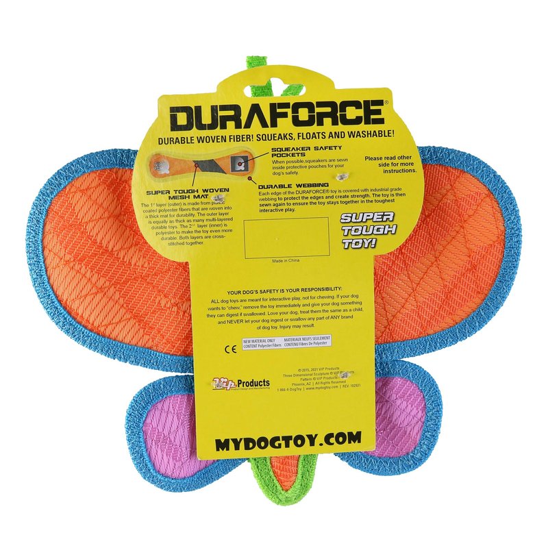 DURA FORCE Durable Woven Fiber - Butterfly - Squeakers - Multiple Layers. Made Durable, Strong & Tough. Interactive Play Dog Toy (Tug, Toss & Fetch). Machine Washable & Floats (Orange Butterfly)