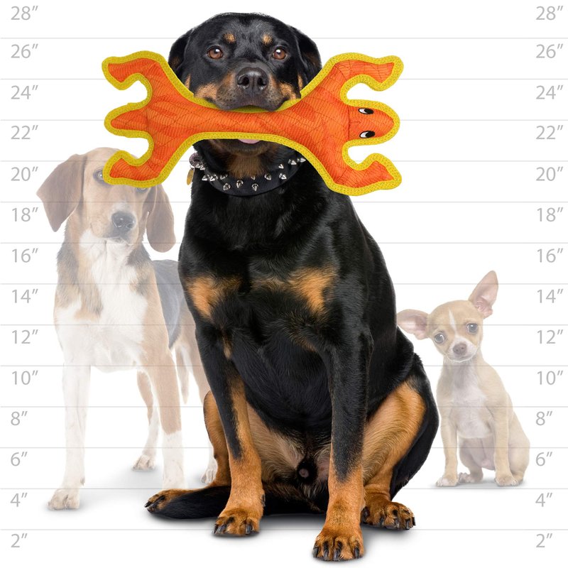 DuraForce® toys are made with durability in mind! The outer layer is made from plastic coated polyester fibers that are woven into a thick mat for durability. The inner layer is made from polyester. Both layers are cross-stitched together to create strength. Each edge of the DuraForce® toy is covered with industrial grade webbing to protect the edges. The toy is then sewn again to ensure it stays together in the toughest interactive play. Squeakers are sewn inside protective pouches for your dog’s safety. DuraForce® toys are built to withstand rigorous interactive play, not aggressive chewing. We use quality, durable materials, but this product is still a “soft” plush dog toy that can be damaged from chewing. Care for your dog like you would your child. Do not allow your pet to swallow any part of ANY brand of dog toy.