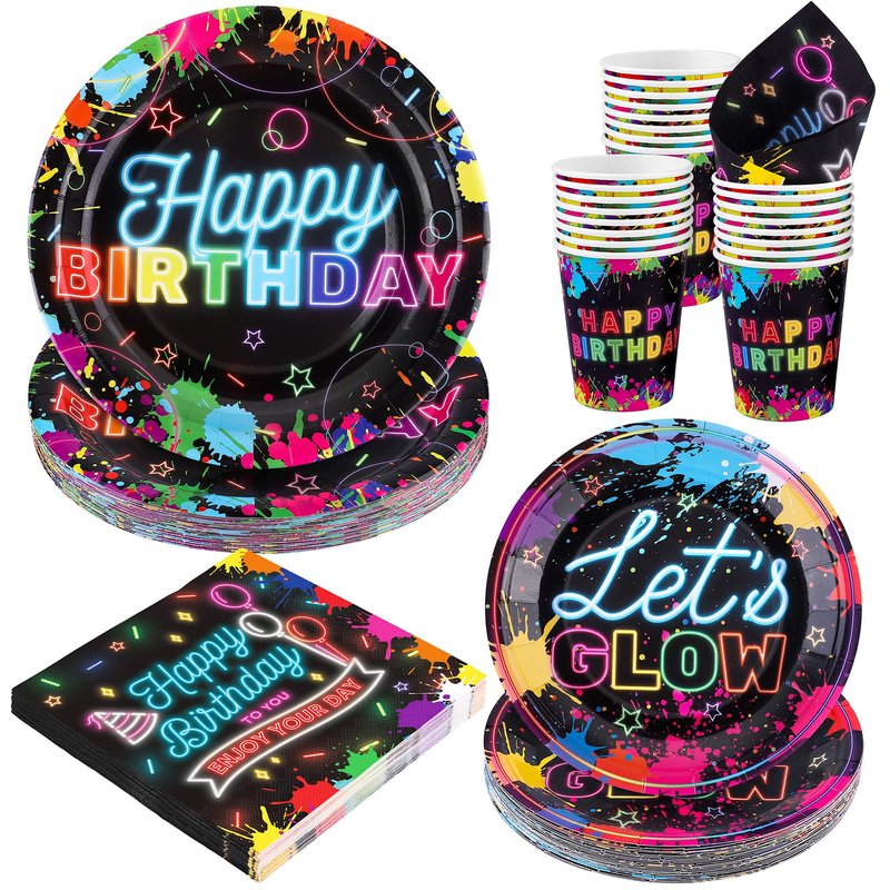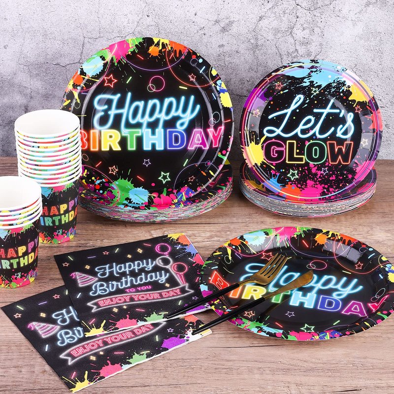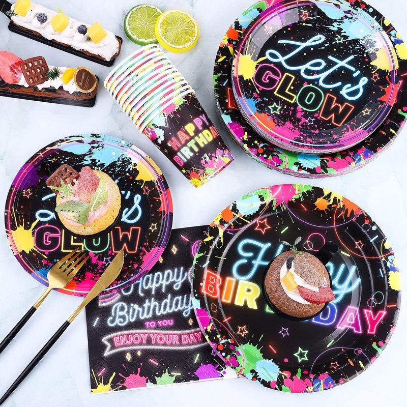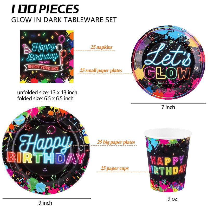 - Neon Glow Party Supplies for 25 People: This 100-piece glow in the dark tableware set includes 25 7-inch paper plates, 25 9-inch paper plates, 25 paper cups, 25 napkins, which can be used by 25 guests. The unfolded size of the napkin is 13 x 13 inches/33 x 33 cm, and the folded size is 6.5 x 6.5 inches /16.5 x 16.5 cm. The paper cup has a capacity of 9 ounces.