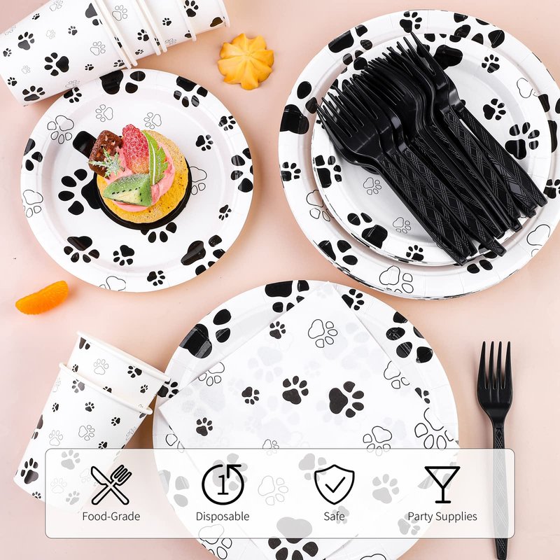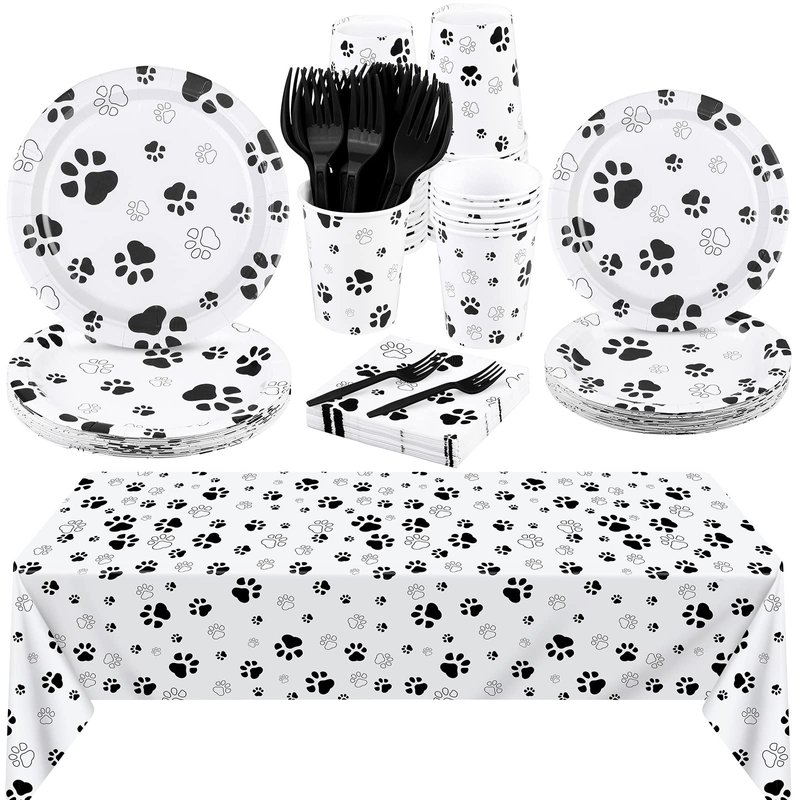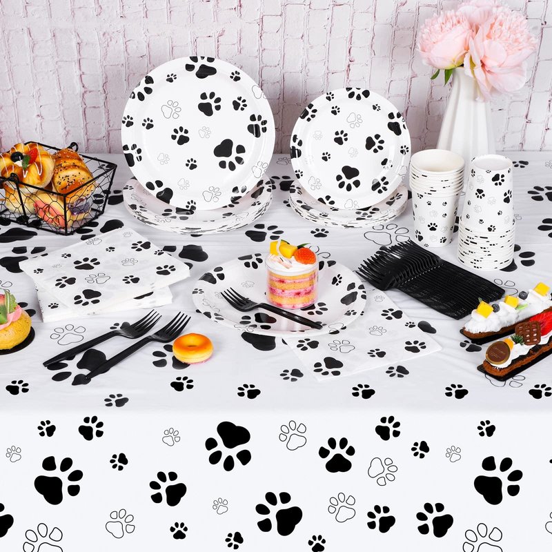 - Package includes: you will receive a complete black-white dog claw party tableware set, including 20 pieces of 7-inch plates, and 20 pieces of 9-inch, 40 pieces of napkins, 20 pieces of 9-ounce paper cups, 20 pieces of forks, and 1 pack of the disposable plastic tablecloth, 108 x 54 inches, a total of 121 pieces, sufficient and convenient for your party use