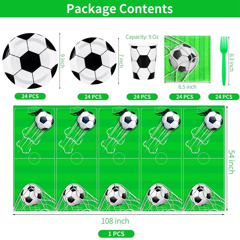 - What you will get: the package comes with 48 pieces of paper plates in 2 different sizes, 24 pieces for each size, 24 pieces of napkins, 24 pieces of paper cups, 24 pieces of forks, and 1 piece of plastic tablecloth, a total of 121, abundant and sufficient for soccer party needs