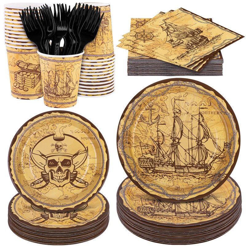 - Pirate Party Table Setting: This pirate party tableware set is great for hosting a pirate-themed party. With these pirate-themed party decorations, the look of your dining table will be upgraded and your guests will have a delightful dining experiece.