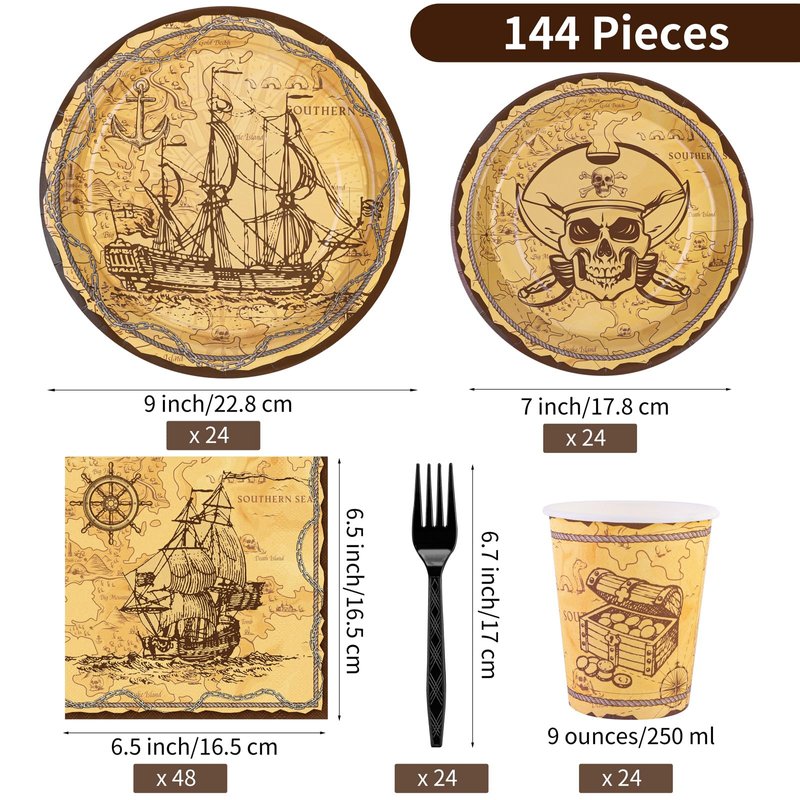 - Pirate Birthday Party Supplies: You'll receive 24 pieces 9-inch pirate party plate, 24 pieces 7-inch pirate party plate, 24 pieces 9-oz paper cup, 48 pieces 6.5-inch pirate birthday party napkin, and 24 pieces black plastic fork, rightly sized to serve 24 guests.