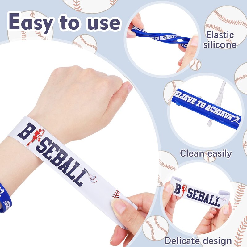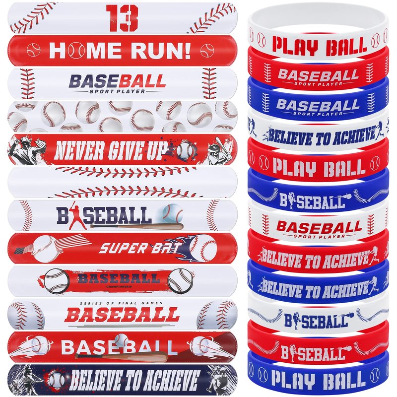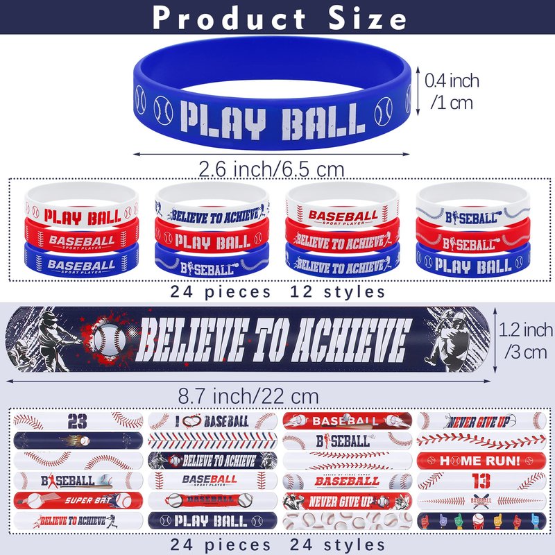 - The package includes: you will receive 48 pieces of baseball bracelets, including 24 pieces of baseball silicone bracelets, which are mainly designed in red, blue, and white, with 2 for each, interesting and attractive; the other 24 pieces are baseball slap bracelets, 24 different designs, 1 piece for each; rich in style and quantity, very suitable for sharing and wearing with friends
