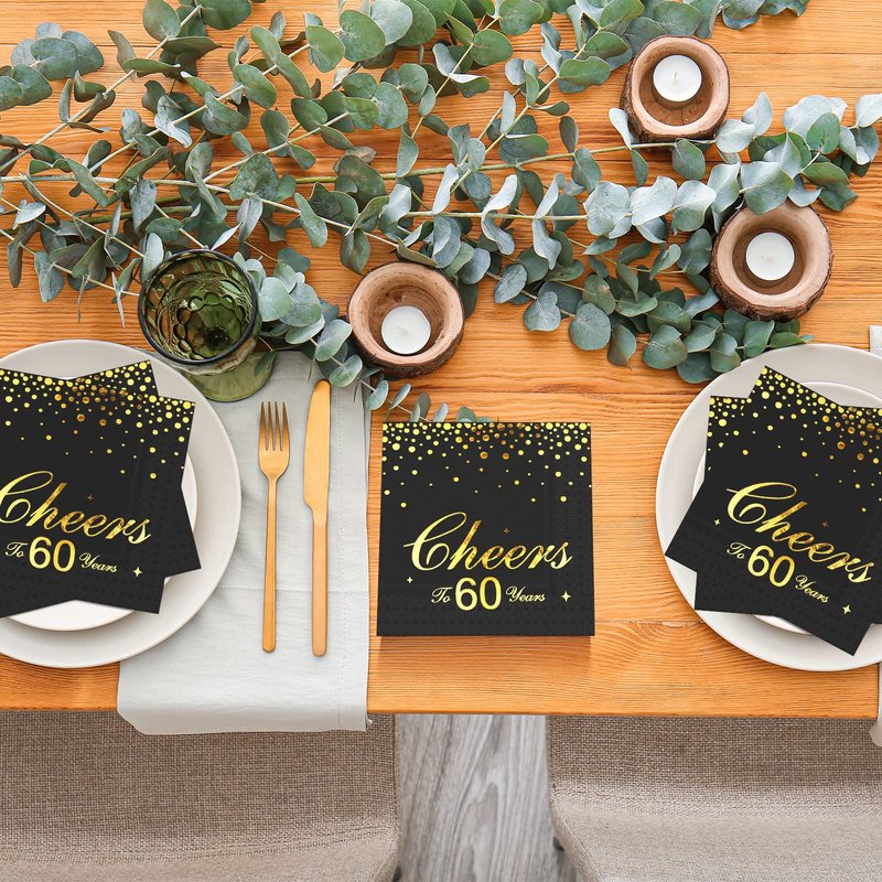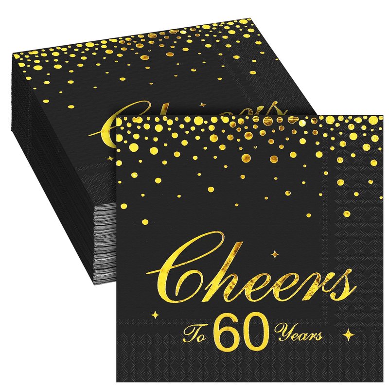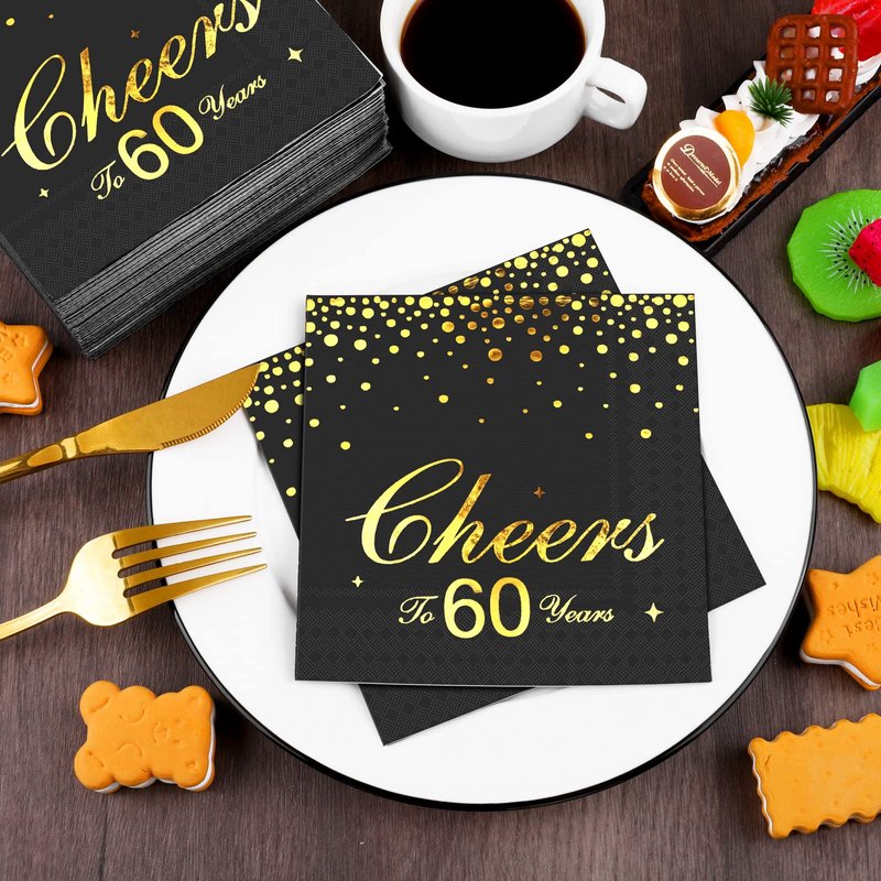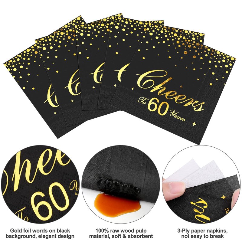 - Unique design: our party napkins are designed with gold foil words "Cheers to 60 Years" on black background, exquisite and elegant; the graceful and modern design of these paper napkins will bring your guests a surprise on formal occasions and activities
