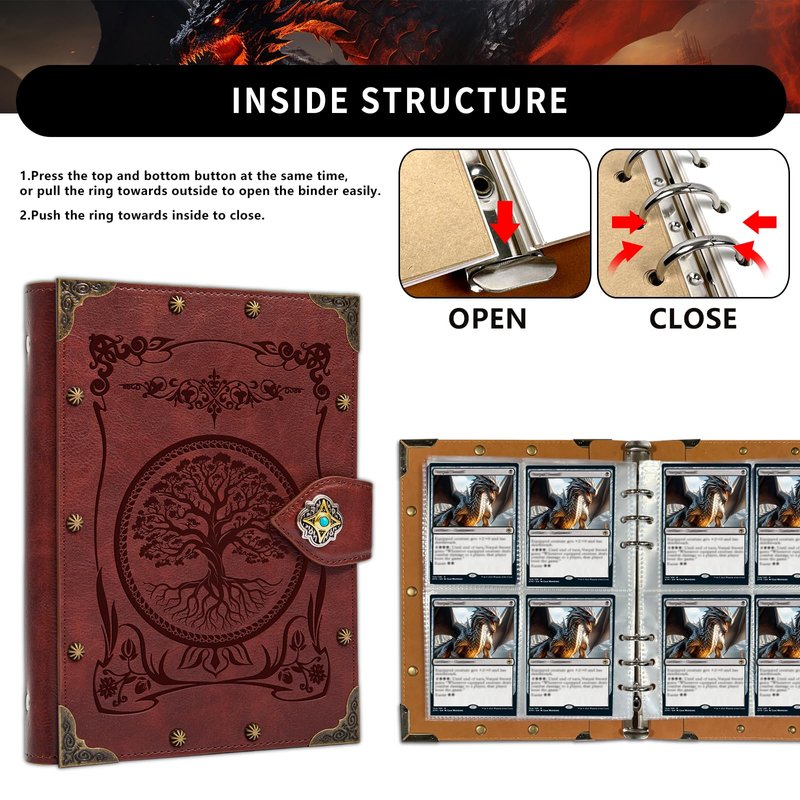 - Unique Design:Rivets with vintage faux leather complete the overall look.using embossed pattern design brings true touch,Not just printed.with metal rivets bounded around the entire cover (front and back),there are 8 pcs metal book corners covered which can protect the Card Binder better.A great collectors accessory to increase any card enthusiast experience with immersive hints by the look.
