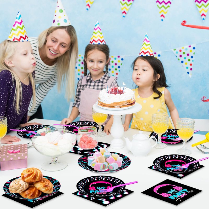 • ♫ [PACKAGE INCLUDES]: This music decoration set contains the items needed for the party. It has a total of 96 pcs and it can serve 24 guests. It include 24 * 9'' paper plates, 24 * 7'' paper plates, 24 napkins(6.5 inch,folded) with 24 pcs forks.