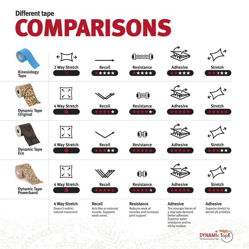 - ✅ Designed to work mechanically, alter movement patterns while absorbing load and re-injecting that energy back into movement, all without limiting range of motion. Comparatively, Kinesiology tapes are designed to work neurophysiologically, attempting to alter pain perception, muscle activity or circulation via contact with and lifting of the skin. See Dynamic Tape web and YouTube channel for best instructions on correctly applying and removing tape.