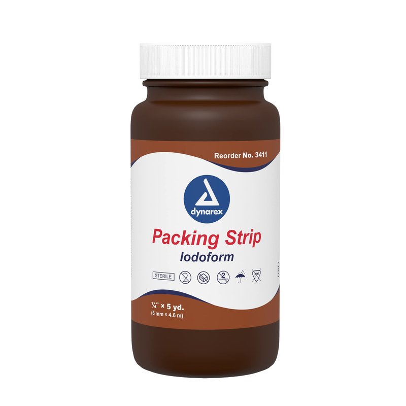 - SUPERIOR ABSORPTION: Dynarex Packing Strip, available in multiple sizes, with and without iodoform, are highly absorbent and used by professional medical personnel. The strip is sterile and packaged in a large bottle with a screw top cap.