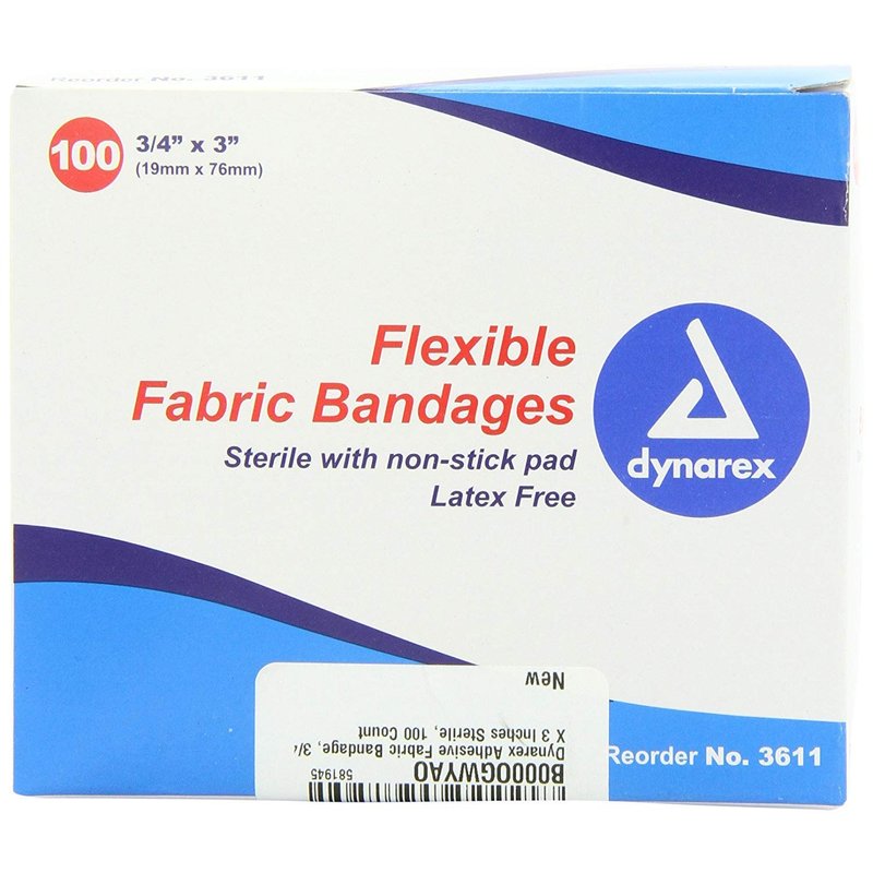 Dynarex Fabric Adhesive Bandages - Sterile & Flexible Fabric Bandages for Wounds - Non-Stick Pads - Individually-Wrapped First Aid Supplies - No Latex - 3/4x3", 100 Count(Pack of 1)