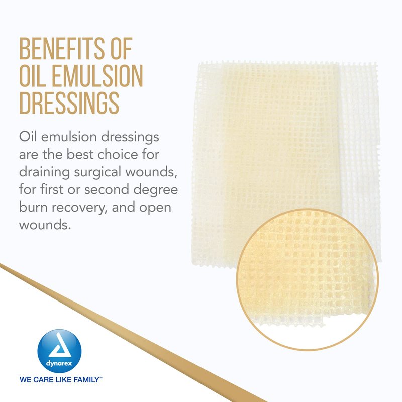 - GENTLE ON SKIN: During recovery, these oil emulsion dressings can be changed without further damage or trauma to the skin. They are easy to remove and gentle on delicate, fragile skin. Dynarex provides Best in Class alternative to other leading brands.