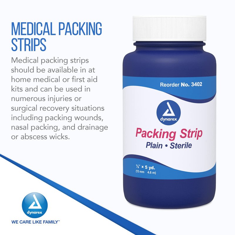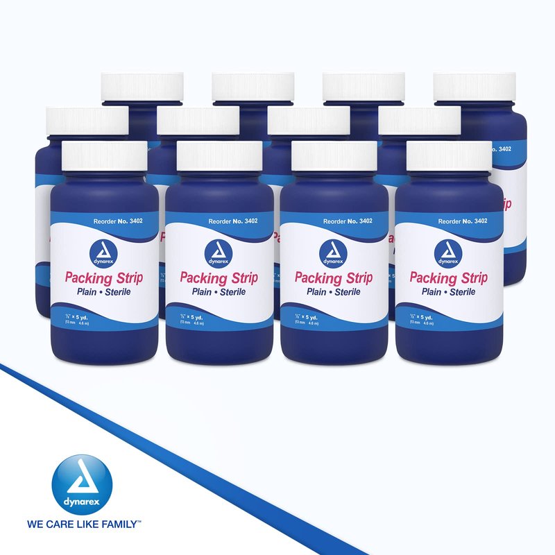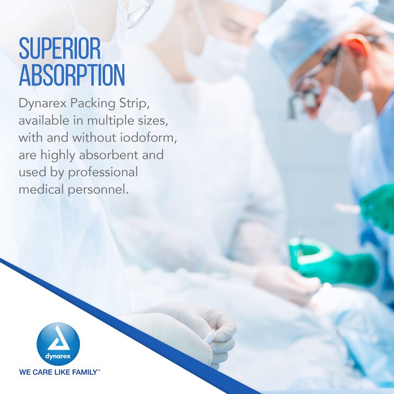 - SUPERIOR ABSORPTION: Dynarex Packing Strip, available in multiple sizes, with and without iodoform, are highly absorbent and used by professional medical personnel. The strip is sterile and packaged in a large bottle with a screw top cap.