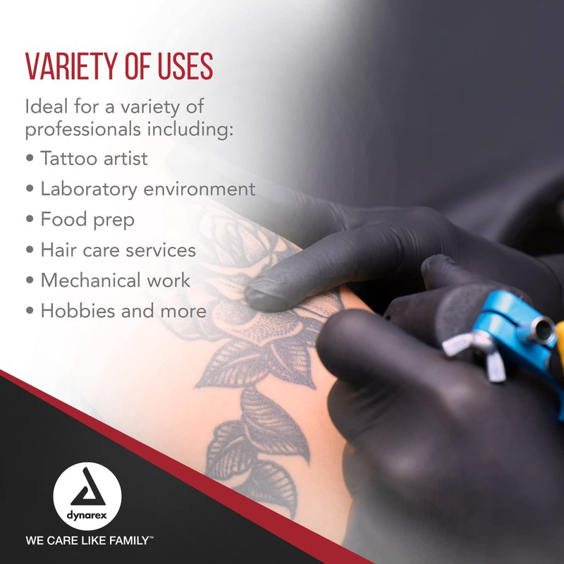 - VARIETY OF USES: Disposable black exam gloves, ideal for a variety of professionals including tattoo artists, laboratory environment, food prep, barbers, estheticians, hair care services, mechanical work, hobbies that include working with paints and more.