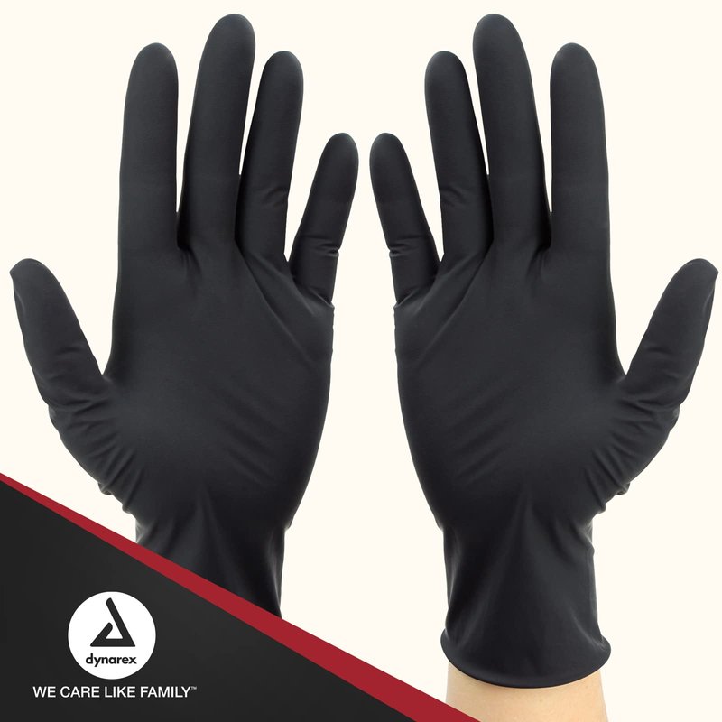 Protect your hands in well designed and constructed professional comfort. Safe-Touch black disposable nitrile exam gloves are latex-free, and provide a comfortable stretch while maintaining durable protection. These gloves are extraordinarily strong and puncture resistant. Black nitrile disposable medical-grade gloves are used by tattooists and other professions because their black color reduces the visibility of stains when working with dye, ink, haircolor or paint while fully protecting hands. Dynarex nitrile gloves are sleek with a polymer lining and deliver hand conforming flexibility in barely-there natural feel comfort to prevent physical fatigue. The narrow wrist cuff reduces penetration of fluids or contaminants keeping skin safe, dry and sanitary. Secure fit reduces hand fatigue while allowing you to complete finely detailed tasks safely and confidently.
