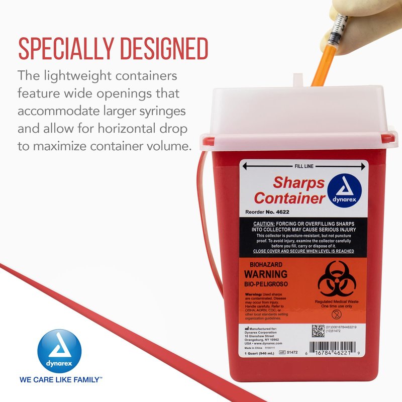 - EASY TO USE: The Dynarex Sharps Container is easy to use and includes a lid to make it simple to deposit used needles in a safe and responsible manner. Larger openings allow for disposal of larger syringes. This lightweight container has secure handles.