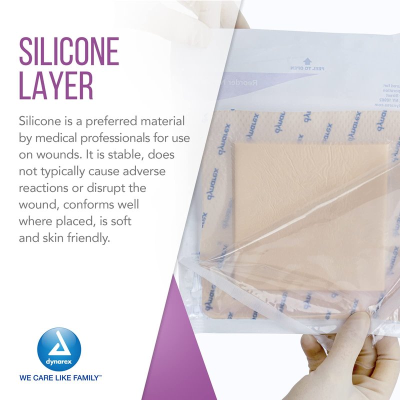 - SILICONE LAYER: Silicone is a preferred material by medical professionals for use on wounds because it is stable, does not typically cause adverse reactions or disrupt the wound during healing, conforms well where placed, is soft and skin friendly.
