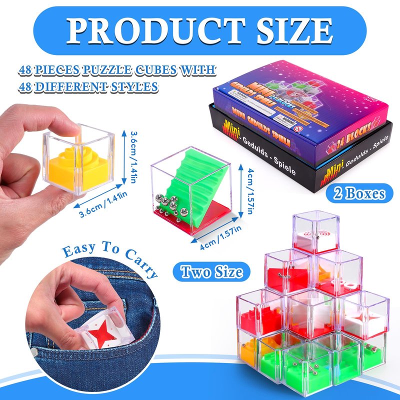 - Package Include: Our package includes a total of 48 pieces different difficulty brain teaser puzzles, two boxes, each boxe contains 24 pcs cubes. A lot of fun, waiting for you to challenge.