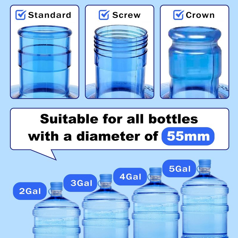 - Upgrade Leak-Free Water Jug Cap: Suitable for 2, 3, 4, 5 gallons, standard /screw /crown tops water jug with mouth size 55-60mm. Extended design 5 gal water jug cap with a good seal, after seven days of sideways storage & upside-down storage rest testing, non-spill and leak-free